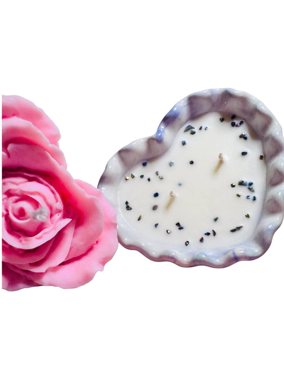 Очаровательная свеча станет изысканным дополнением вашего интерьера. Гипсовая тара в форме сердца с нежным узором по краю наполнена ароматным воском, украшенным мерцающими частицами. Два фитиля обеспечивают равномерное горение и создают мягкое, рассеянное освещение. Свеча созданная из соевого воска, с приятным не навязчивым ароматом черничного йогурта, подарит наслаждение каждому, кто вдохнет этот прекрасный аромат.