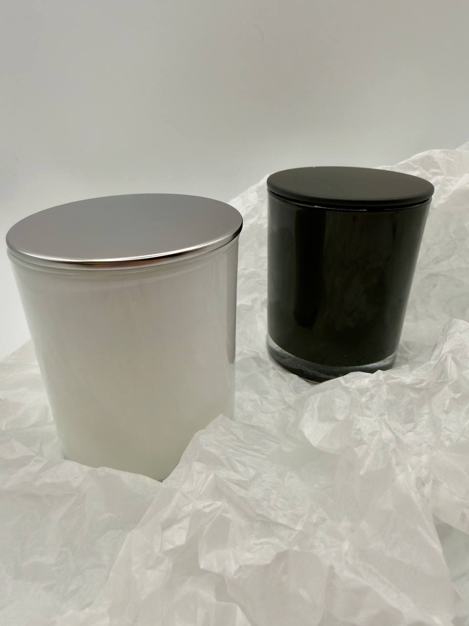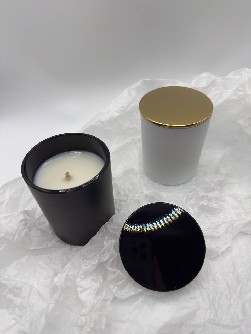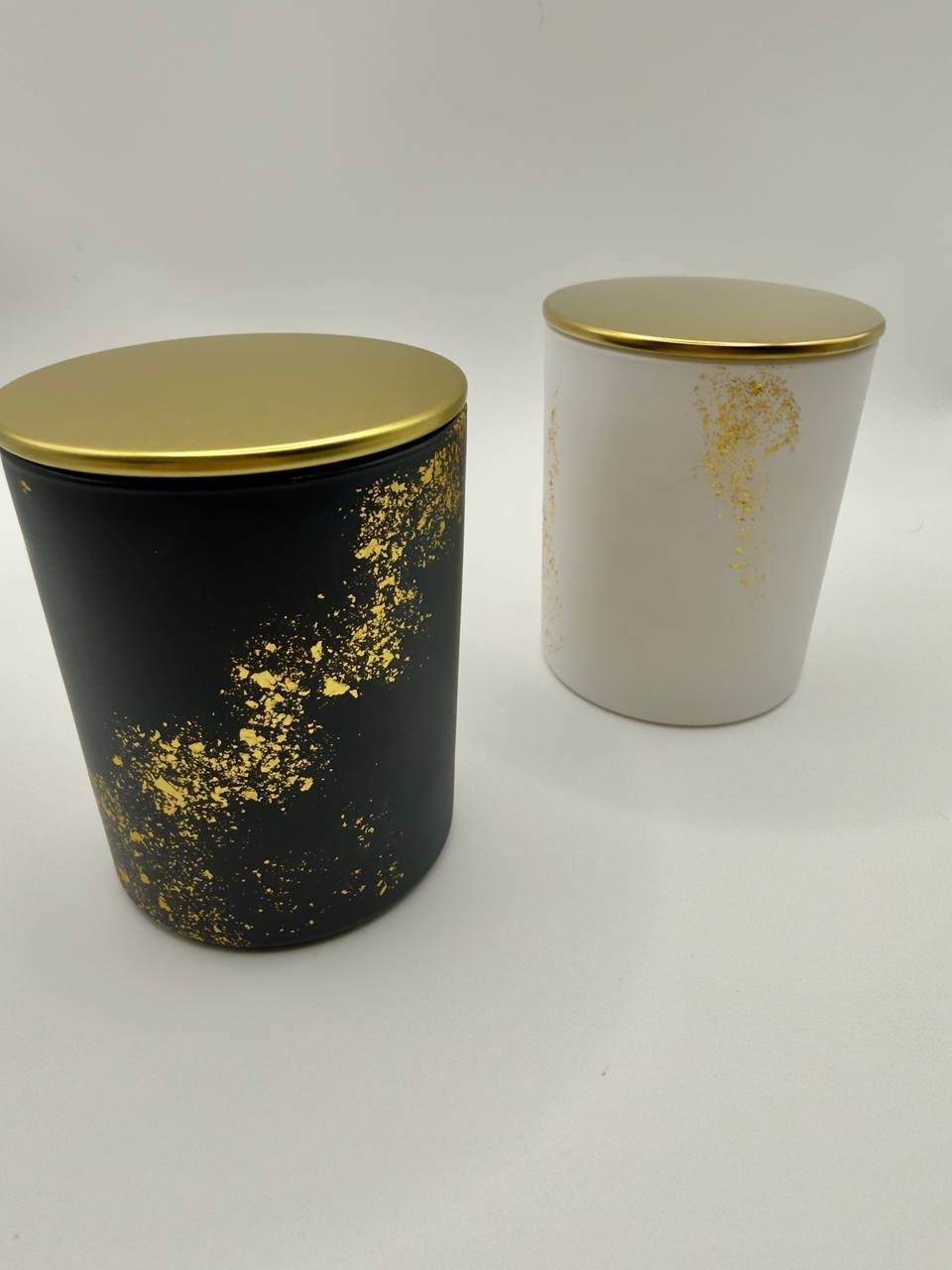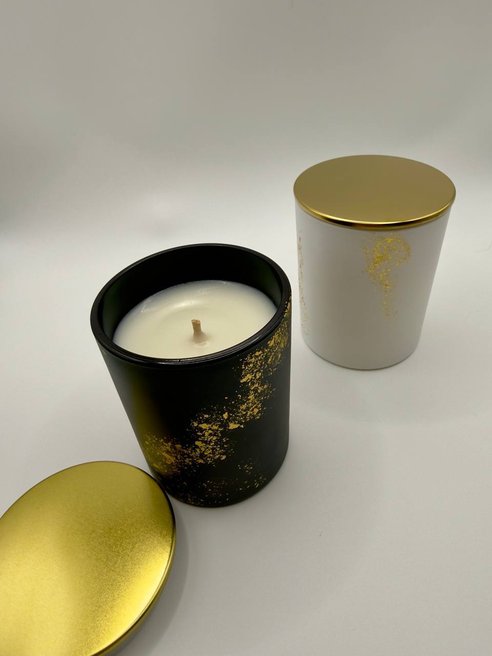 Свечи в матовых белом и черном стаканах с золотыми брызгами — минимализм встречается с роскошью. Контрастный дизайн и легкий блеск золота создают утончённую атмосферу уюта и современного стиля.